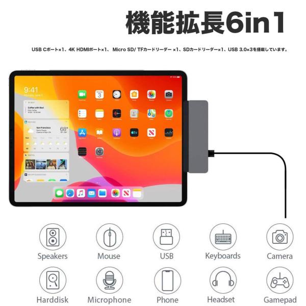 iPad Pro向け 6in1 USB C ハブ Type C 3.0ハブ USB Type Cハブ 4K HDMI出力 3.5mmイヤホンジャック Micro SD/ TFカードリーダー SDカードリーダー 6in1