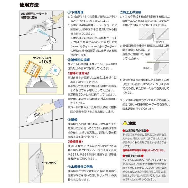 サンモルCは、ALC(ヘーベル)施工時の座堀り・溝掘り・穴開け箇所・欠け部などの補修をALCの特性および美観を損なわず容易に行える補修材です。白セメントと骨材を主成分とし、これに特殊な混和剤を加えた既調合タイプで、水を加えて練るだけで施工ができます。