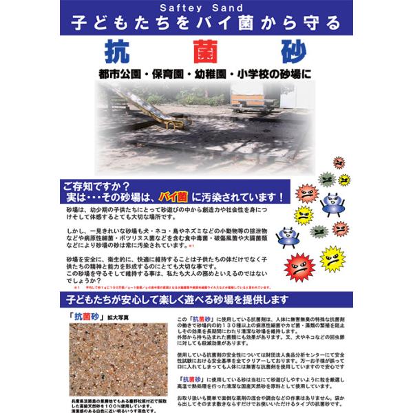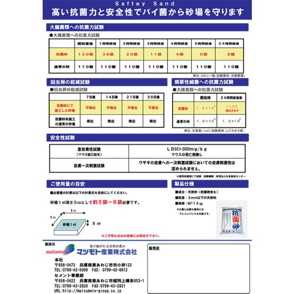 砂場内の約130種類以上の病原性細菌の繁殖を防止し、犬ネコの回虫も阻止
