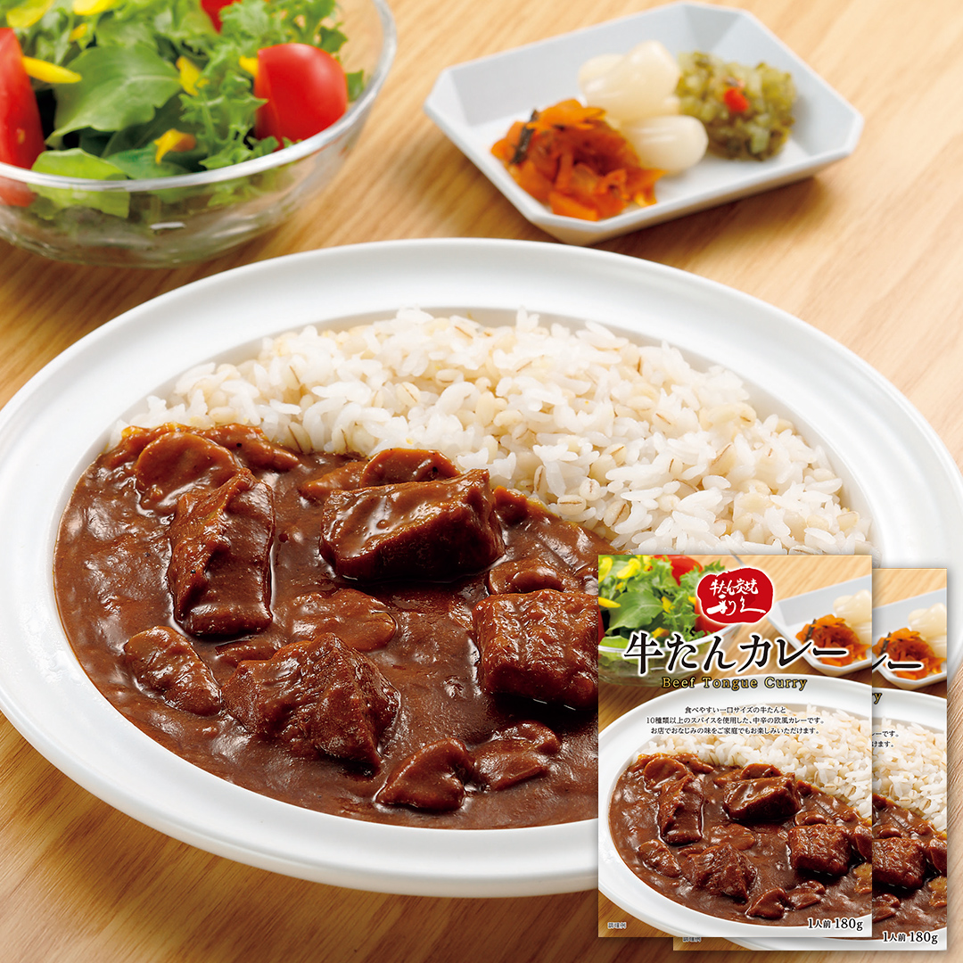 食べやすい一口サイズの牛たんと、10種類以上のスパイスを使用した、中辛の欧風カレーです。お店でおなじみの味をご家庭でもお楽しみいただけます。