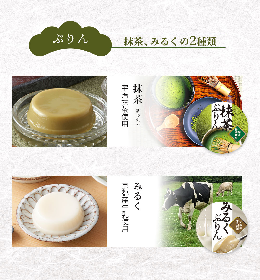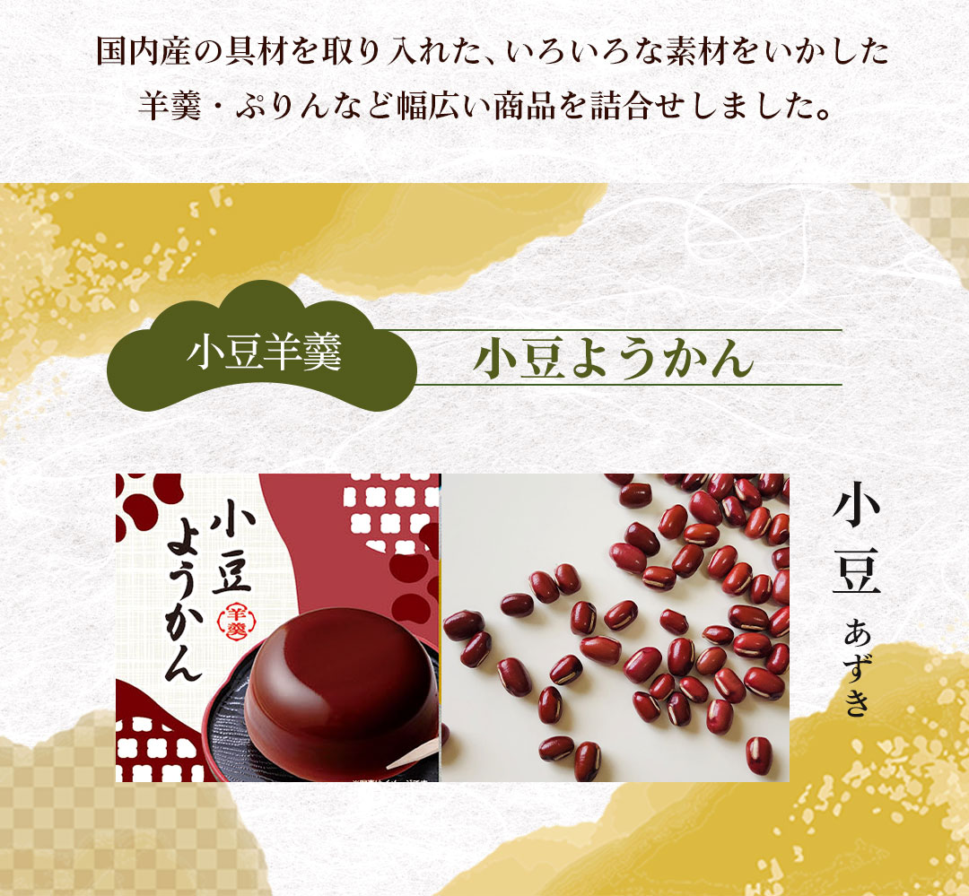 和風素材を使って、羊羹・ぷりん・葛餅などさまざまな食感の和風菓子を詰合せました。