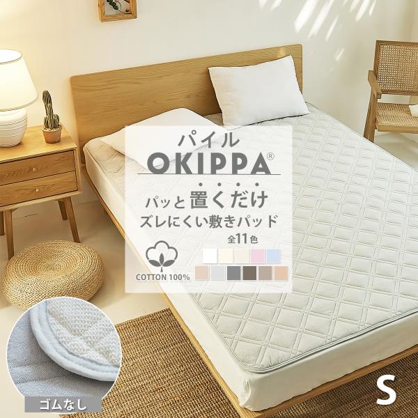 敷きパッド ゴム無し 置くだけ 簡単 時短 さらさら シングル OKIPPA コットン シングル オキッパ 綿100% 洗いざらし オールシーズン K37710S