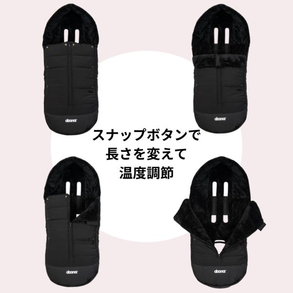 ドゥーナのフットマフは、お子様の頭部、背面、足先までしっかりカバーし、寒さの厳しい季節でも快適にドゥーナでお出かけを楽しめます。