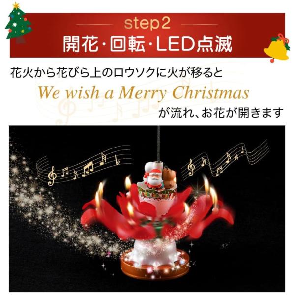 花火に点火すると、お花の中心に向かって花火がパチパチと移動して、 We wish a Merry Christmas を演奏しながらくるくる回って開花するよ。