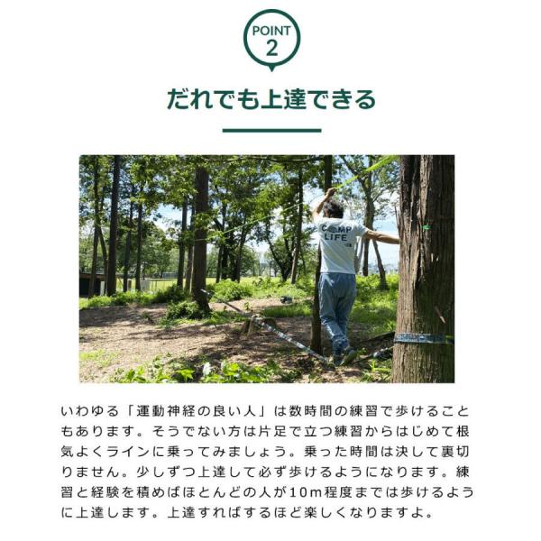 スラックラインとは、細い帯状のラインの上でバランスを楽しむ綱渡りの様な遊びです。