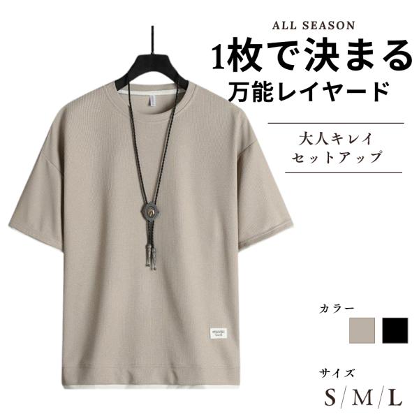 Tシャツ メンズ 半袖 フェイクレイヤード クルーネック 重ね着風 無地 シンプル カジュアル 夏 薄手 吸汗速乾