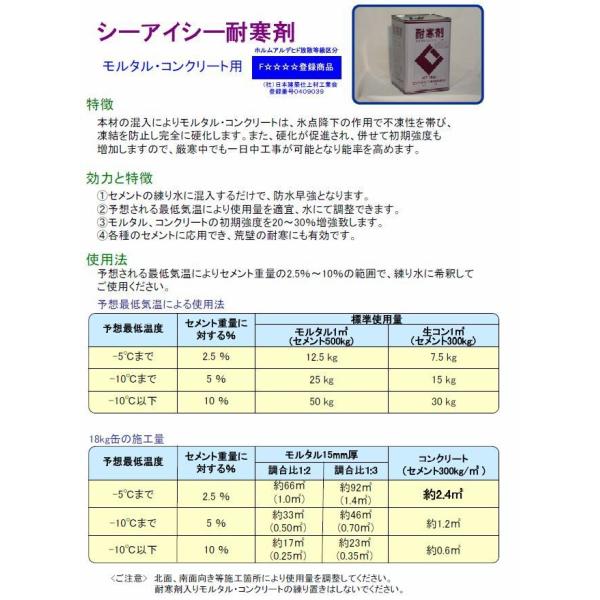 氷点降下の作用で不凍性を帯び、凍結を防止し、完全に硬化致します。又、硬化が促 進され併せて初期強度も増加しますので、厳寒中でも一日中工事が可能となります。※こちらの商品は、1缶毎に送料がかかります。2缶以上御注文のお客様には送料変更させていただき御連絡後出荷させていただきます。
