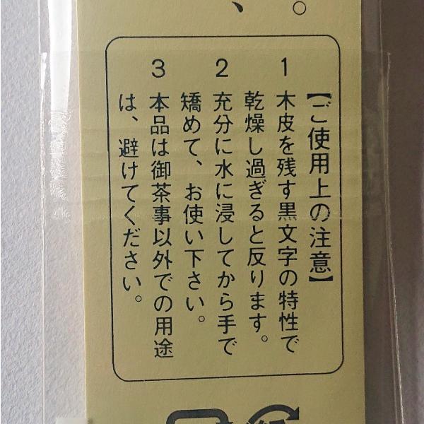 使用する前に10分ほど水に浸してから、水分をふき取ります。水分を程よく含んでいるので、和菓子の皮やアンコが黒文字にくっつくのを防ぎます。
