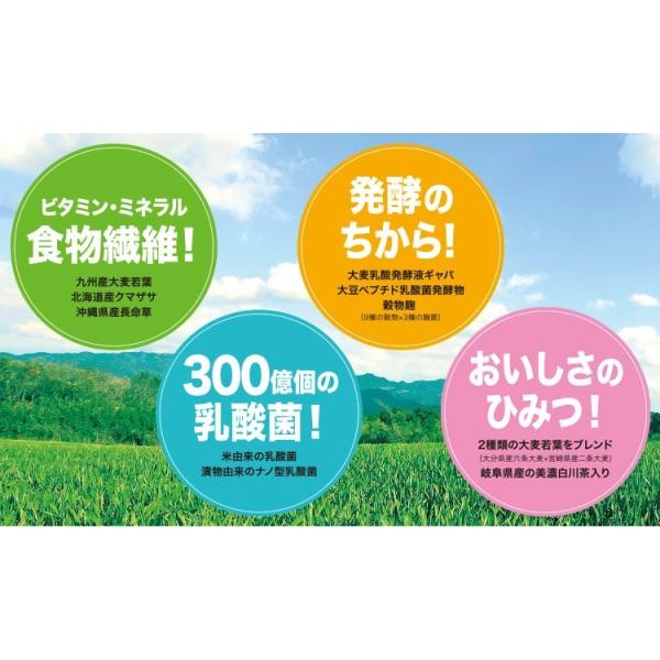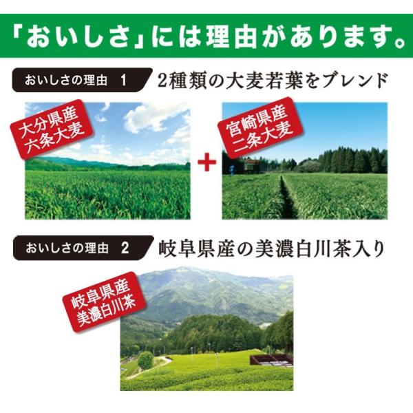 国内産、2種類の大麦若葉をブレンド。美濃白川茶入り。甘さ控えめで飲みやすい。