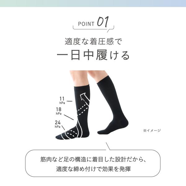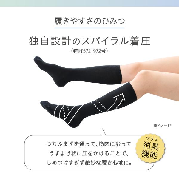 つちふまずから足の筋肉に沿ってうずまき状に圧をかけるスパイラル着圧(特許取得※1)により、しめつけすぎることのない力加減。
