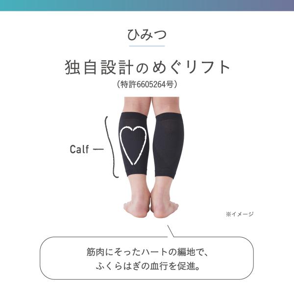 独自のめぐリフト構造(特許取得※2)により、筋肉にそったハート型の編地でふくらはぎをサポート。血行促進、足のむくみ軽減に。