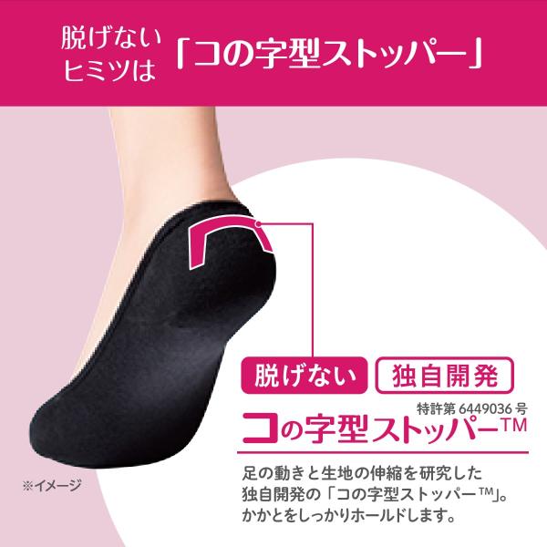 足の動きと生地の伸縮を研究した独自開発・特許技術の「コの字型ストッパー(TM)」がかかとをしっかりホールドし、「一日中、脱げない」を実現。