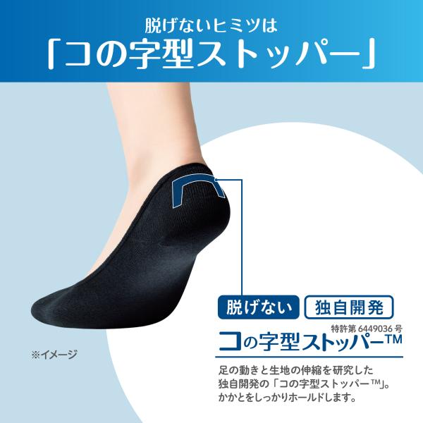 足の動きと生地の伸縮を研究した独自開発・特許技術の「コの字型ストッパー(TM)」がかかとをしっかりホールドし、「一日中、脱げない」を実現。