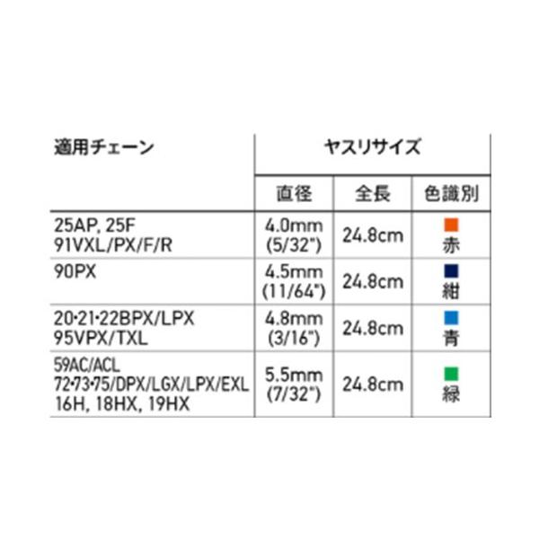 正確なチェーンの目立て作業に欠かせないソーチェーン用のヤスリです。耐久性に優れた熱処理鋼を採用しています。サイズを識別しやすいように、1本1本のヤスリに色が付くようになりました。