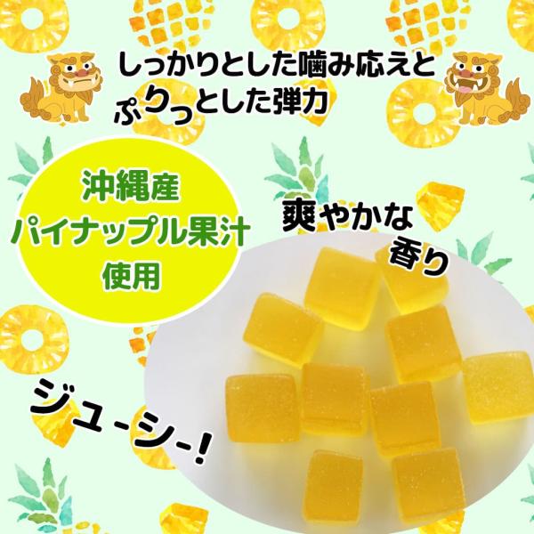 原材料名:水あめ(国内製造)、砂糖、ゼラチン、パインアップル果汁(沖縄県製造)、粉末オブラート/ソルビトール、酸味料、香料、光沢剤、ベニバナ黄色素、乳化剤、(一部にゼラチンを含む)