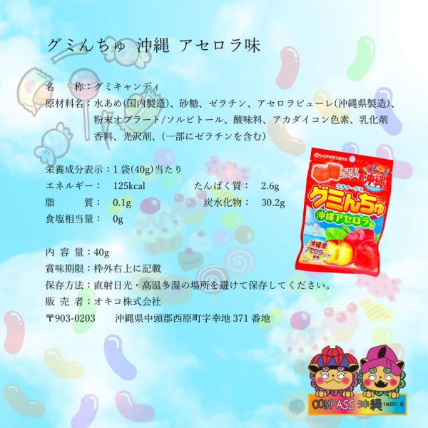 原材料名:水あめ(国内製造)、砂糖、ゼラチン、アセロラピューレ(沖縄県製造)、粉末オブラート/ソルビトール、酸味料、アカダイコン色素、乳化剤、香料、光沢剤(一部にゼラチンを含む)