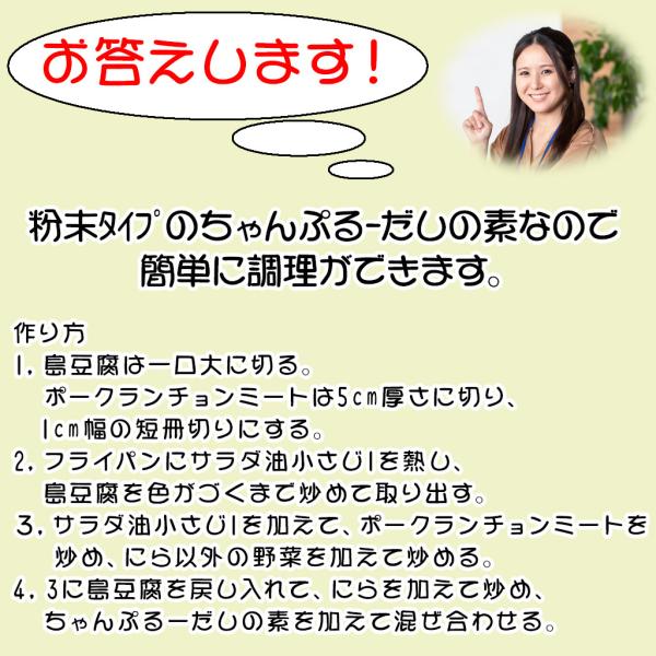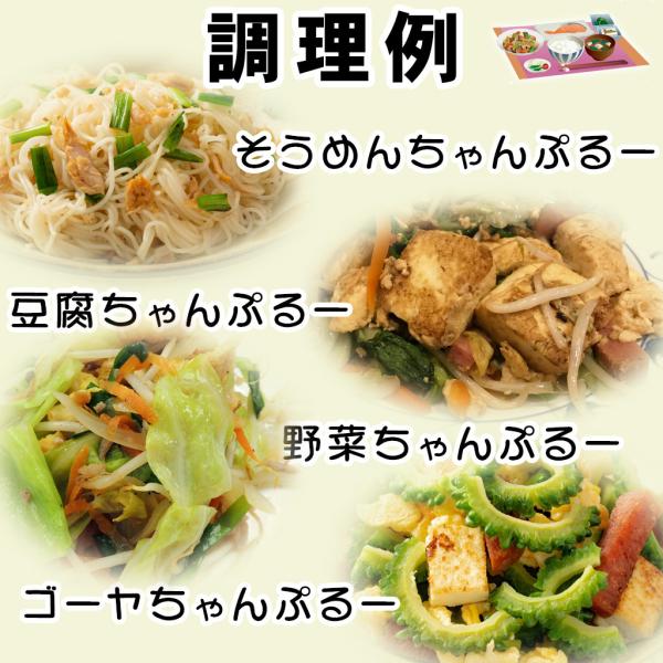 ゴーヤーちゃんぷるーはもちろん、ふーちゃんぷるーやそーめんちゃんぷるーなど、さまざまなちゃんぷるー料理に対応できる商品です。