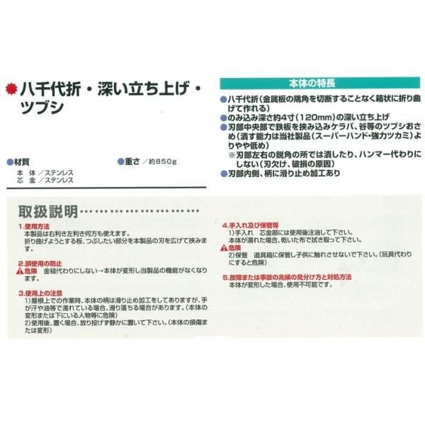 ・刃部中央部で鉄板を挟み込みケラバ、谷等のツブシおさめ(潰す能力はスーパーハンド・強力ツカミよりやや低め)
