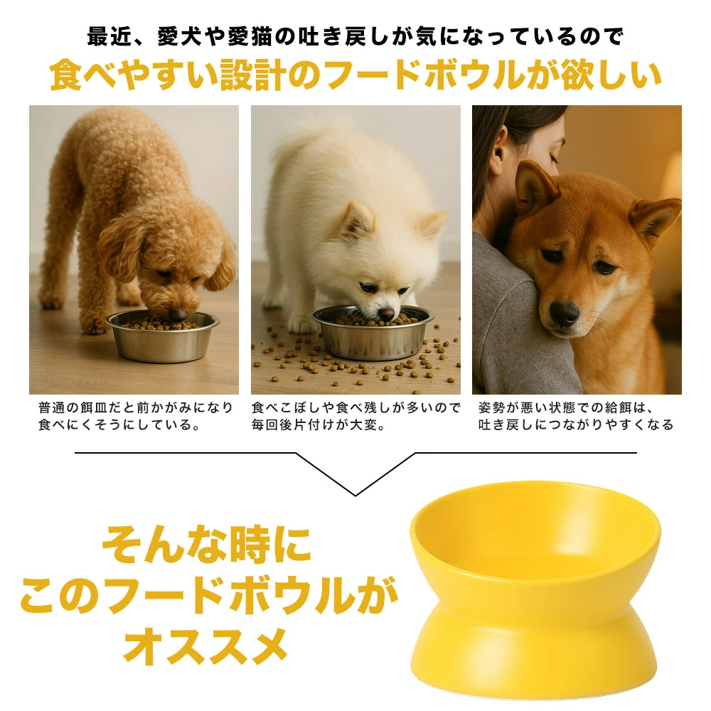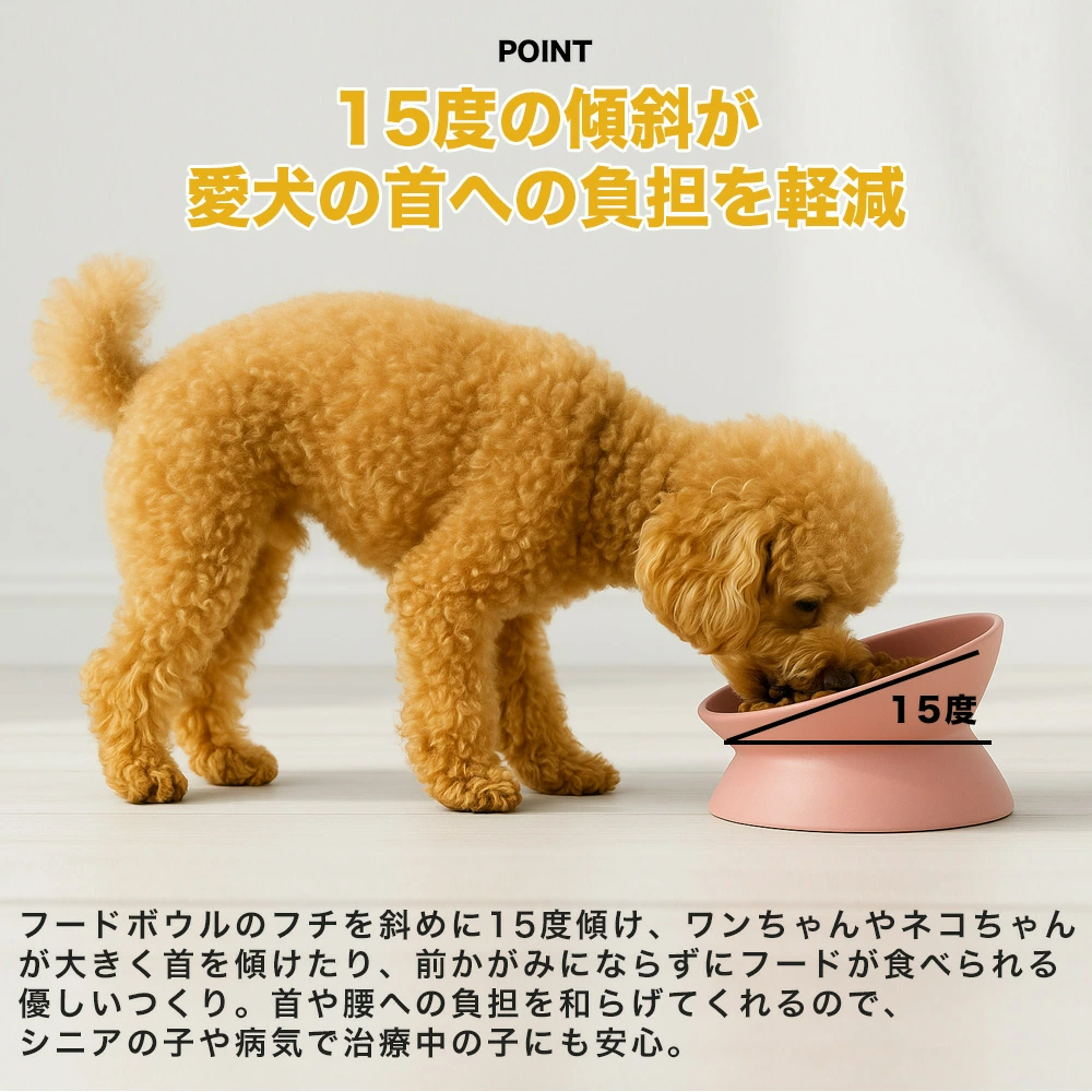 食事中の前かがみや食べこぼし、姿勢の悪さにお悩みではありませんか。本商品は、犬や猫が自然な姿勢で食事できるよう設計された、当店オリジナルのフードボウルです。フチに約15度の傾斜をつけることで、首や腰への負担を軽減し、シニア犬や治療中の子にもやさしい設計となっています。