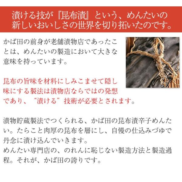 ■素材へのこだわりと漬ける技の結晶。かば田の代表作、昆布漬 辛子めんたいこ。