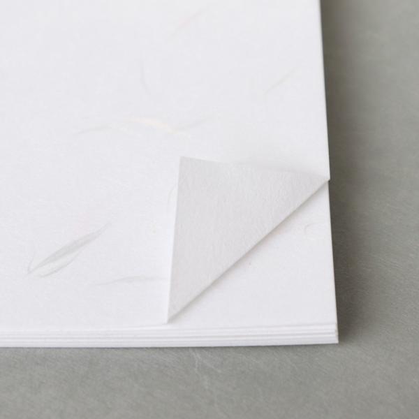 大礼紙は、「はな」と呼ばれるツヤのある繊維が抄き込まれているのが特徴です。こちらの花大礼紙は白、水色、ピンクの淡い色の繊維を抄きこんでいます。