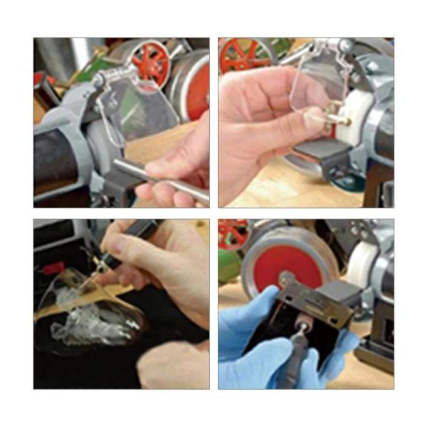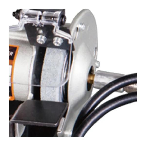 研磨砥石研磨用ファイバーホイール付きで、小さなパーツから刃物などの研ぎやサビ落としなど、小物部品の加工に大変便利です! フレキシブルシャフトを使用して、各種先端工具を取りつけると、下記のような作業ができます! 【用途】 砥石・バフを使用して、金属などの研削・ツヤ出し作業に、フレキシブルシャフトを使用して、細かい研削作業に使用できます。 ガラス・ボトル・貝ガラ・陶磁器・タイル・石材・貴金属・非鉄金属・樹脂・木材などの模様彫り、文字彫刻から金属のバリ取り・金属加工、研磨作業、切断作業などあらゆるプロ作業からホビー作業まで幅広く使用できます。 電圧:AC100V 周波数:50/60Hz 電流:0.6A 消費電力:50W 回転数:50Hz約2850min-1/60Hz約3450min-1 本体サイズ:約長さ130×幅165×高さ130(mm) コード長:約1.8m 質量:約1.8kg(フレキシブルシャフト除く) 定格時間:15分 砥石(一般鉄工用):外径75×厚さ13×穴径Φ12.7(mm)/A#80 フェルトバフ:外径75×厚さ17×穴径Φ12.7(mm) フレキシブルシャフト:全長約1100mm・チャック能力:直径2.35mm/直径3.00mm・質量:約0.2kg