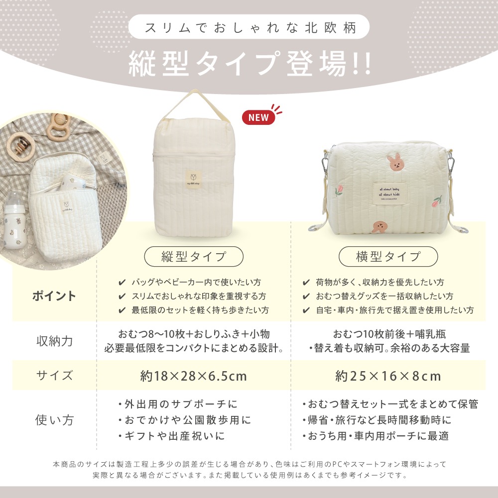 縦型はスリムで片手操作しやすく、バッグイン収納に最適。横型は開口が広く出し入れラクで、哺乳瓶も収納可能。おむつ約8〜10枚収納。