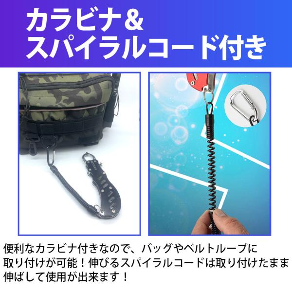 フィッシュグリップは伸びるスパイラルコード付きなので、バッグやベルトループに付けたまま使用可能!