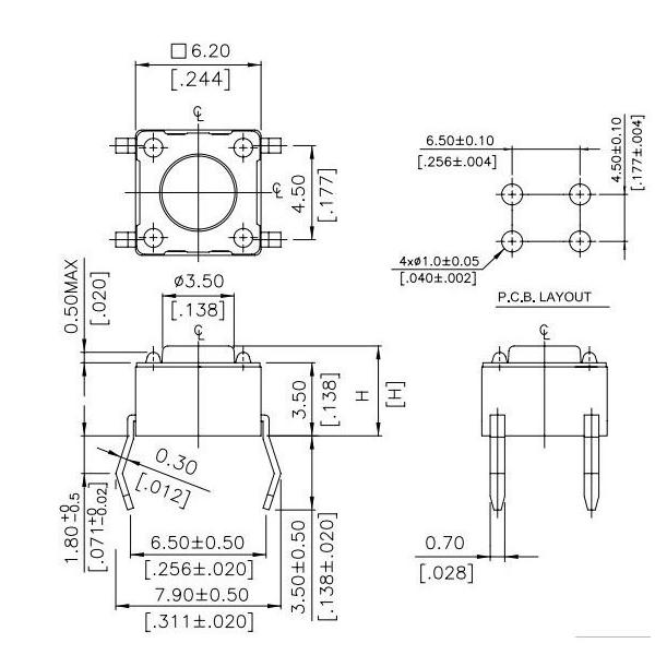基板取付用のタクトスイッチです。2.5mmピッチの基板に使用できます。