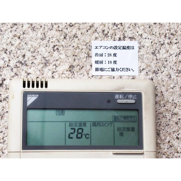 エアコンの設定温度は冷房:温度28度、暖房:18度に設定し、節電にご協力をお願いするシールもございます。