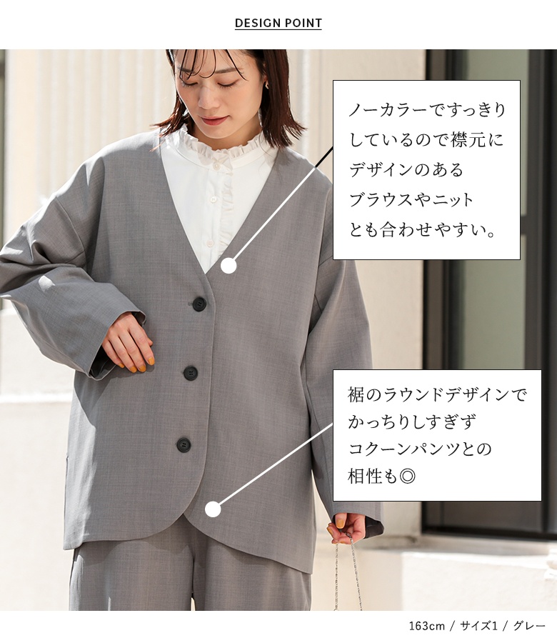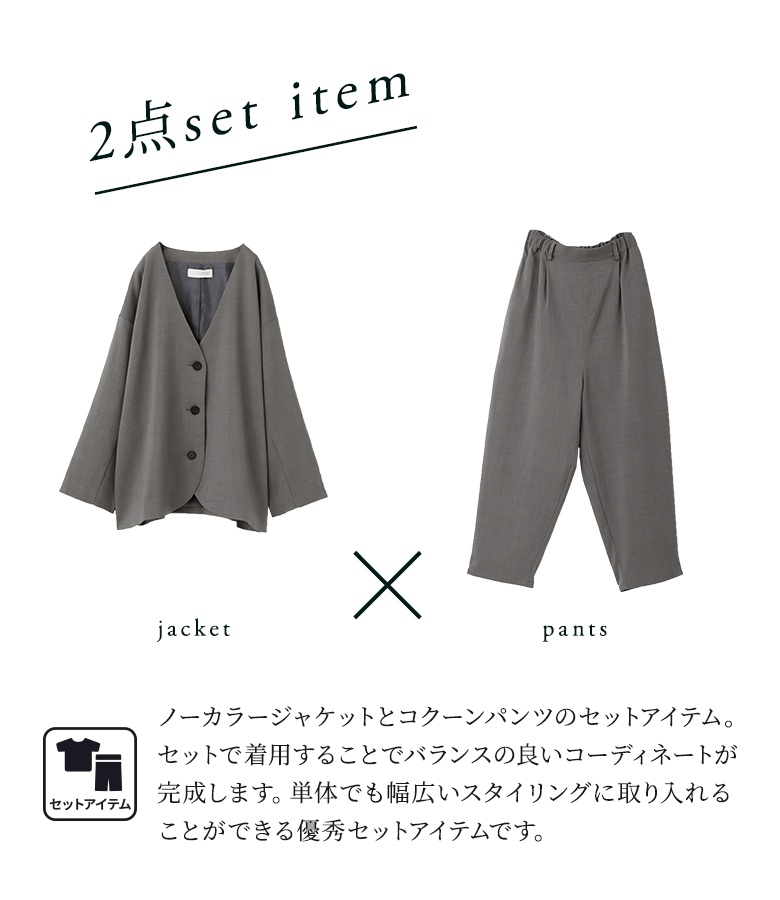 セットアップ レディース アウター ボトムス ジャケット 長袖 コクーンパンツ ロング 秋 冬 春 夏 まとめ買い 上下セット ツーピース ライトアウター 羽織り ノーカラージャケット パンツ ロングパンツ ノーカラー n'OrLABEL ノアールレーベル 大人女子 大人可愛い お洒落可愛い 大人カジュアル ベーシック オフィスカジュアル 上品 きれいめ ミディ丈 ミドル丈 コクーン ヨーク ウエストゴム 無地 タフタ生地 ポケット おうちで洗える 裏地付き オールシーズン ロングシーズン フォーマル カジュアル シンプル キレカジ オフィス・ビジネス 可愛い系 ゆったり ゆる 楽ちん 動きやすい Sサイズ Mサイズ Lサイズ LLサイズ 3Lサイズ XLサイズ ぽっちゃり 体型カバー 大きいサイズ プラスサイズ 10代 20代 30代 40代 50代 60代 女子会 オフィス 通勤 お買い物 お出掛け 旅行 おしゃれ お洒落 パーティー 二次会 結婚式 入学式 卒業式 オケージョン セレモニー 謝恩会 学校行事 お宮参り 七五三 ママスーツ osharewalker オシャレウォーカー おしゃれうぉーかー グレー 灰色 ブラック 黒[ID]15oo0q8[n'OrLABELノーカラーラウンドヘムジャケット×コクーンパンツセットアップ]