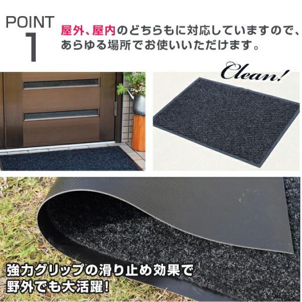 ・靴底についた、塵や土砂などの汚れを屋内に持ち込ませない! パイル地とマット表面の凹凸によって、靴底についた泥、砂などの汚れを効率よく落とす。