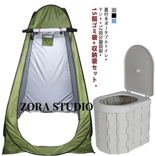 簡易トイレ テント セット 折りたたみ 蓋付き ポータブルトイレ 着替え用テント 排泄処理袋付き 凝固剤 収納袋付き 便座一体型 簡易 災害用トイレ 車用トイレ 登