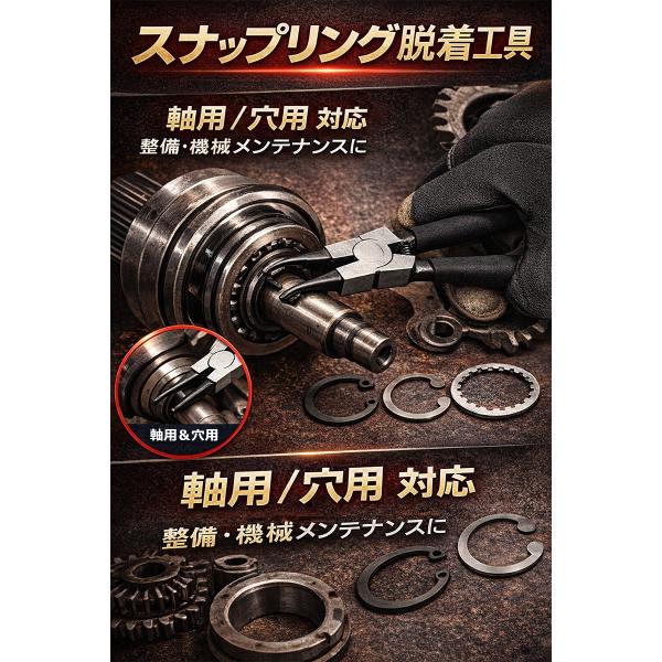 シャフトや軸の外側に、はめてあるスナップリングを縮めて外します。