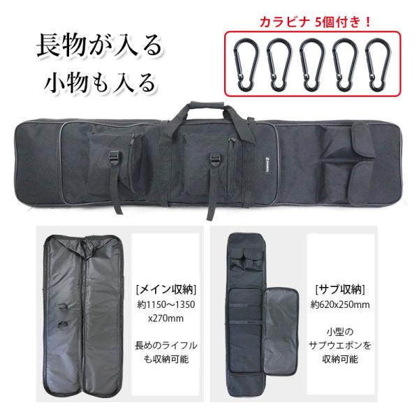 ●サイズ(mm):メイン1150x270(持ち手部を除く)、サブ 620x250 ●小物ポケット:前面5つ、背面2つ ●材質:ナイロン●色:ブラック●カラビナ5個付き