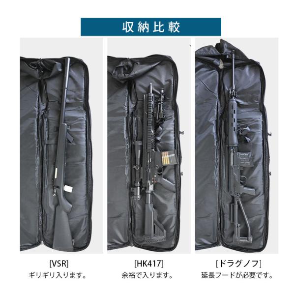 延長フードを使えば1200mm越えのライフルも入ります。生地にクッション材を挟み込んでいるので、やんわりと銃を保護します。移動・保管用の保護ケースとしてもご活用ください。※お持ちの銃のサイズをご確認の上、ご購入下さい。