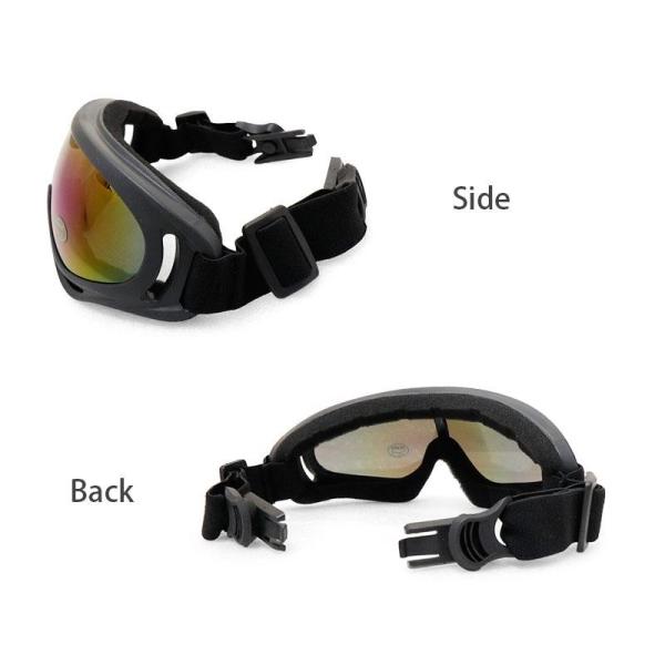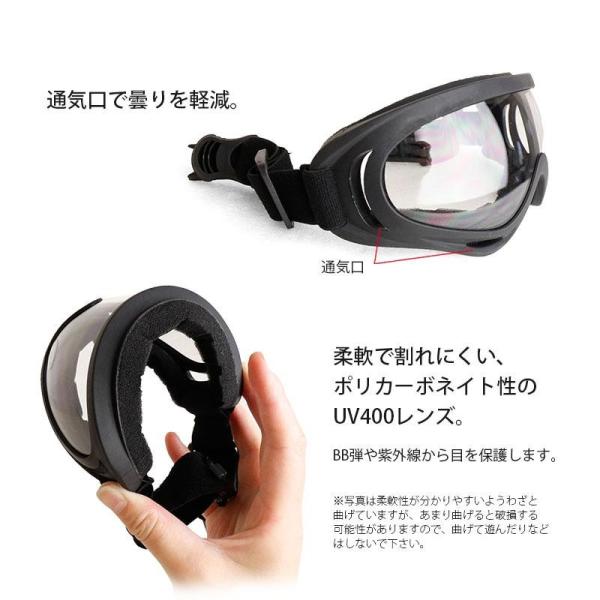 レンズはポリカーボネイト製で柔軟性と耐久性があり、目をしっかりと保護します。UV400仕様で紫外線対策も。
