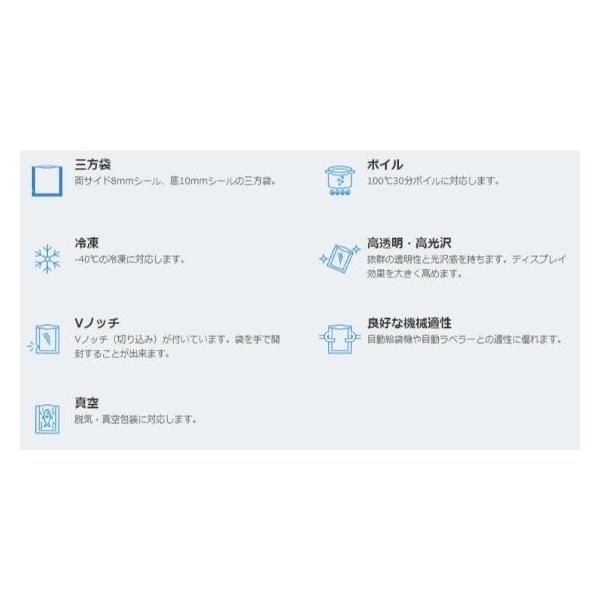◇-40℃冷凍から100℃30分ボイルまで一枚で対応し、独自技術の低カールは自動給袋適性良好です。