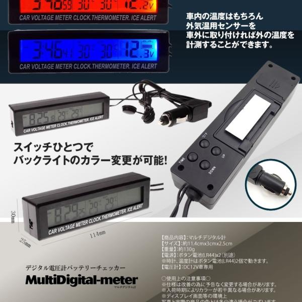車載 電圧計 デジタル 表示 簡単 設置 電圧 バッテリー チェッカー 時計 温度計 シガー ソケット 車内 車外 屋外 車 カー 用品 外気 温度 バックライト ATUMONI