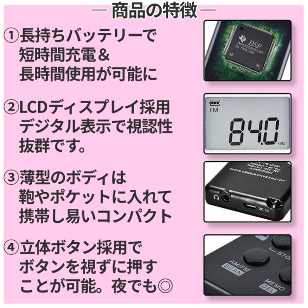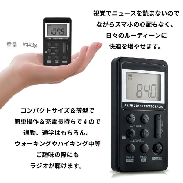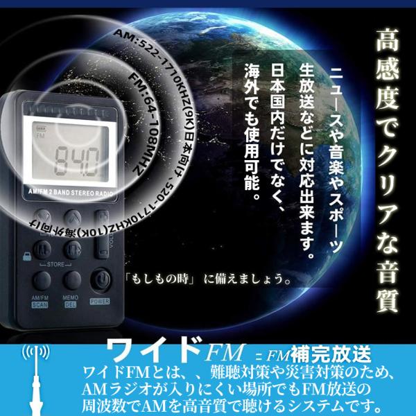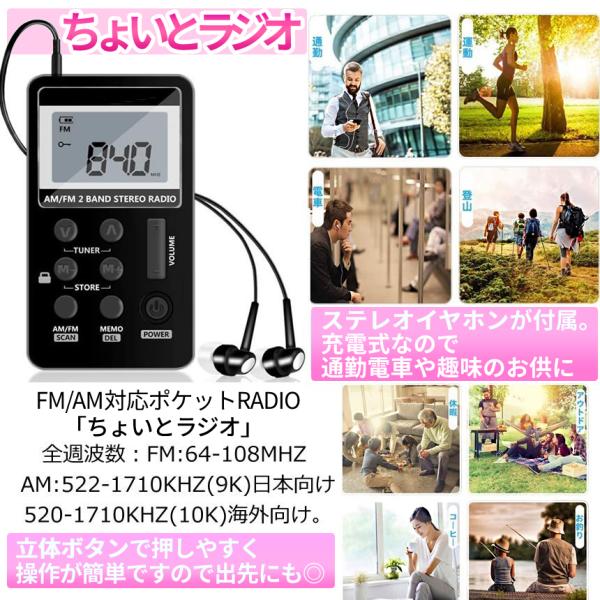 携帯 ラジオ ワイドFM ポケットラジオ 小型 FM AM 対応 USB 充電 高感度 受信 軽量 防災 ポータブル 持ち運び 薄型 ウォーキング 通勤 通学 簡単 操作 CHOIRADI