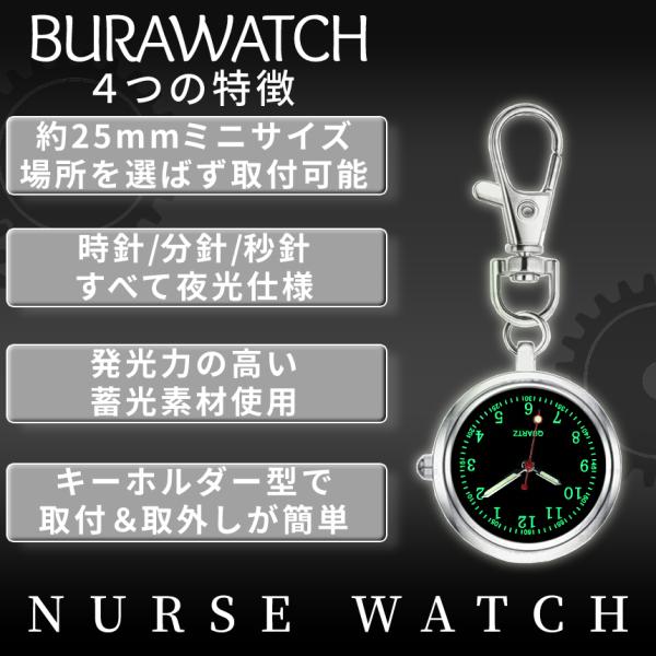 ナースウォッチ ブラック 蓄光 文字 針 逆さ 時計 懐中時計 ミニ 小型 ナース ウォッチ キーホルダー ナスカン リュック バッグ カバン ベルト 通勤 BURAWATCH