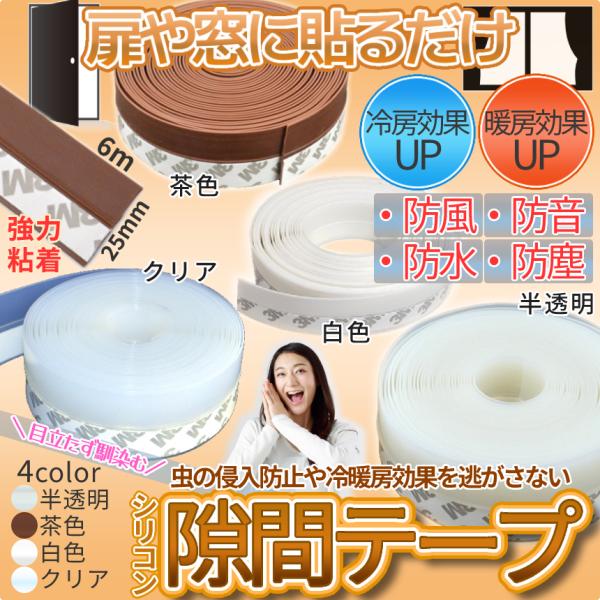 隙間 テープ 扉 ドア 窓 すき間 貼るだけ 白 半透明 クリア 茶 6m 25mm 防寒 冷房 暖房 エアコン 効き目 すき間風 防止 対策 防音 騒音 虫 侵入 SUKKITAPE