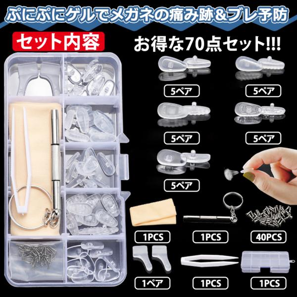 メガネ 鼻パッド 修理 交換 キット 70点 5種類 25ペア 眼鏡 めがね ネジ式 シリコン 鼻あて クッション ズレ 防止 精密 ドライバー ネジ クロス 付き HANAFULL