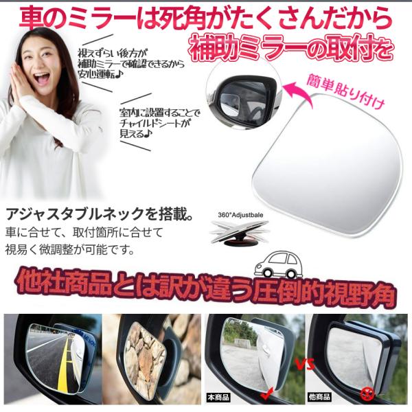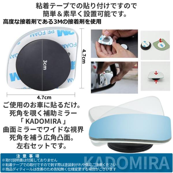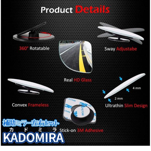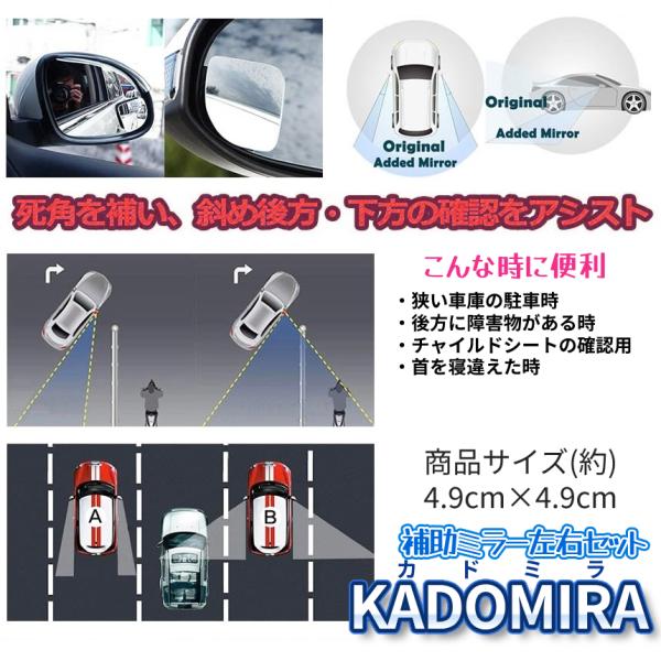 車 補助 サイド ミラー 死角 2個 セット 360度 角度 調節 視野 拡大 サポート 視界 確保 右 左 サブミラー 事故 防止 鏡 駐車 バック 自動車 カー 用品 KADOMIRA