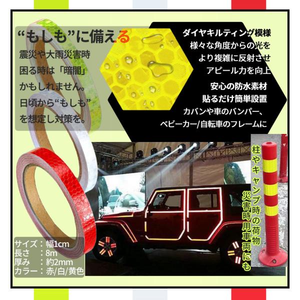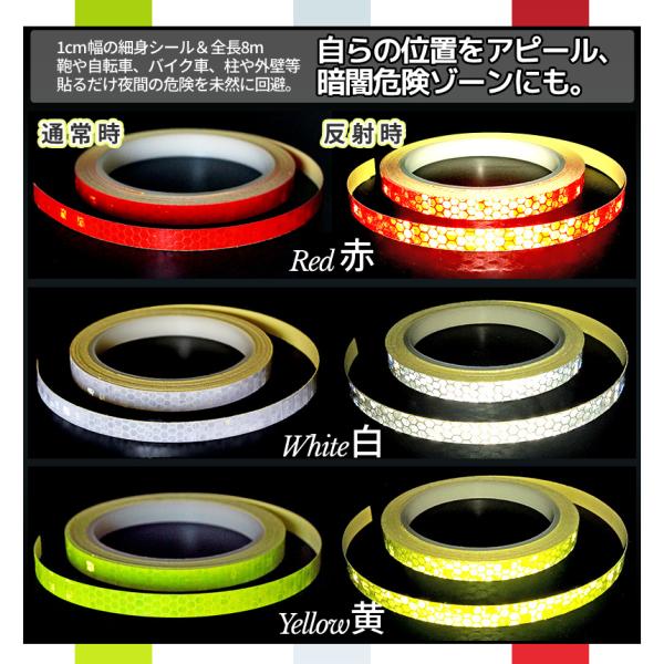 反射テープ 赤 黄色 白 リフレクターテープ 幅10mm×8m 防水 シール ステッカー 高反射 夜間 暗闇 防犯 事故 防止 貼る 自転車 ヘルメット 車 バイク HANTAPE-10