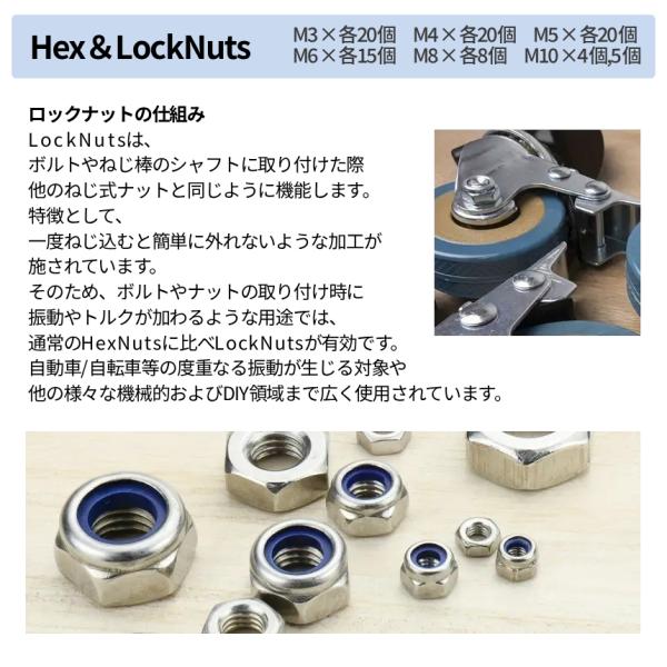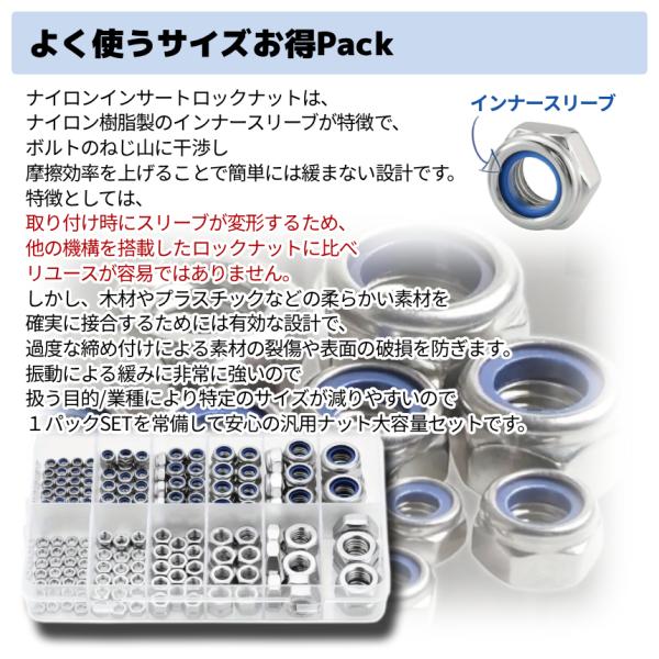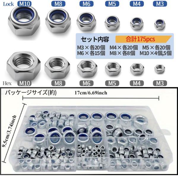 ロックナット 六角ナット 175pcs 大容量セット ナイロンロックナット ボルト ねじ ナイロンスリーブ 緩み止め M3 M4 M5 M6 M8 M10 ステンレス 箱入り RCKNUTTS