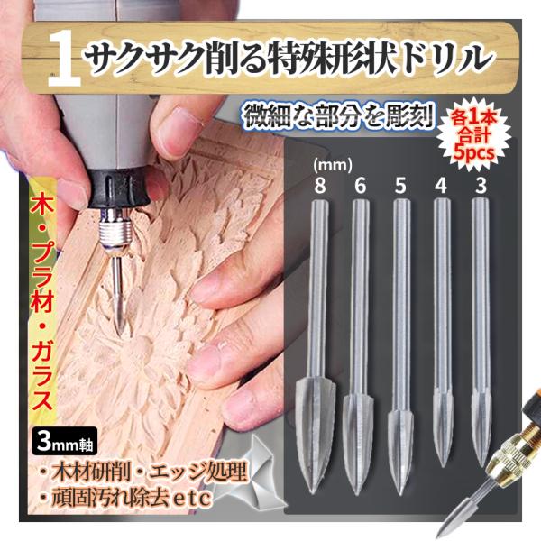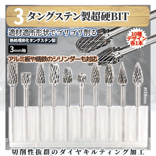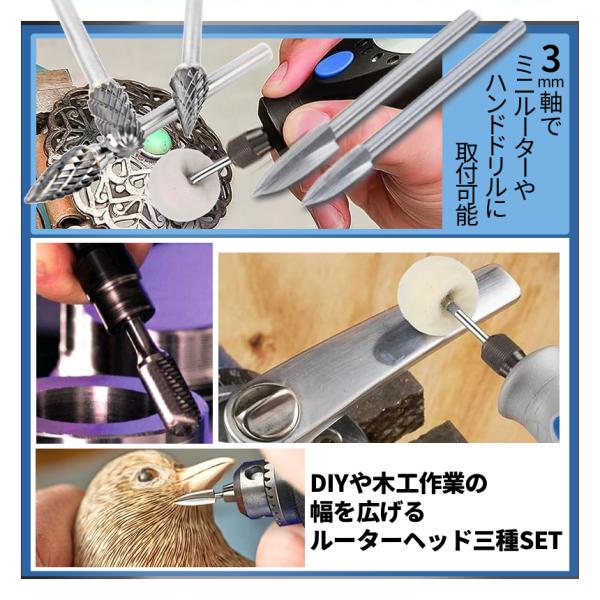 電動 ルーター チップ 3種 特殊形状ドリルビット フェルトバフ タングステン合金 研削ビット 3mm軸 切削 穴あけ グラインダー リューター RUTATPSET