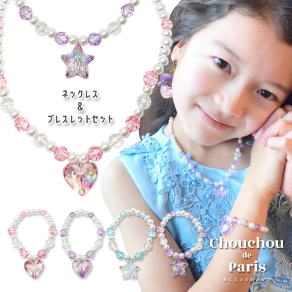 ネックレス ブレスレット セット ハート スター 星 オーロラ キラキラ ビーズ パール ロング 伸びる 伸縮性 子供 子供用 キッズ アクセ アクセサリー