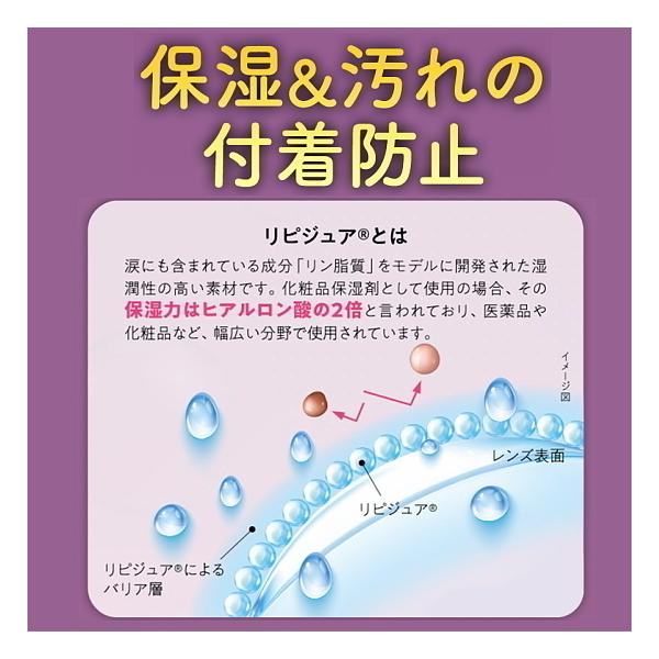2)リピジュアをプラスし、優れた保湿力により、乾燥しにくい装用感と、レンズへの汚れの付着を防ぎます。