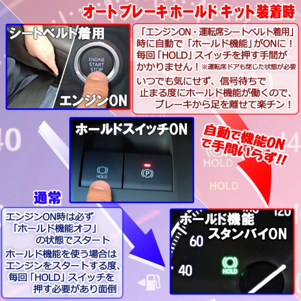 信号待ちなど、停車中にブレーキペダルから足を離せる便利な機能「ブレーキホールド」。しかし純正ではエンジンを切る、シートベルトを外すなどすると、ブレーキホールド機能が解除され、その度に毎回スイッチを押さなければなりません。『オートブレーキホールドキット』を取り付けると、エンジンを掛けるたびに、毎回HOLDボタンを押さなくてもブレーキホールド機能を自動ONにできます。